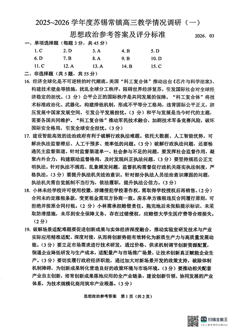 高三政治答案--江苏省苏锡常镇四市高三下学期3月教学情况调研(一)