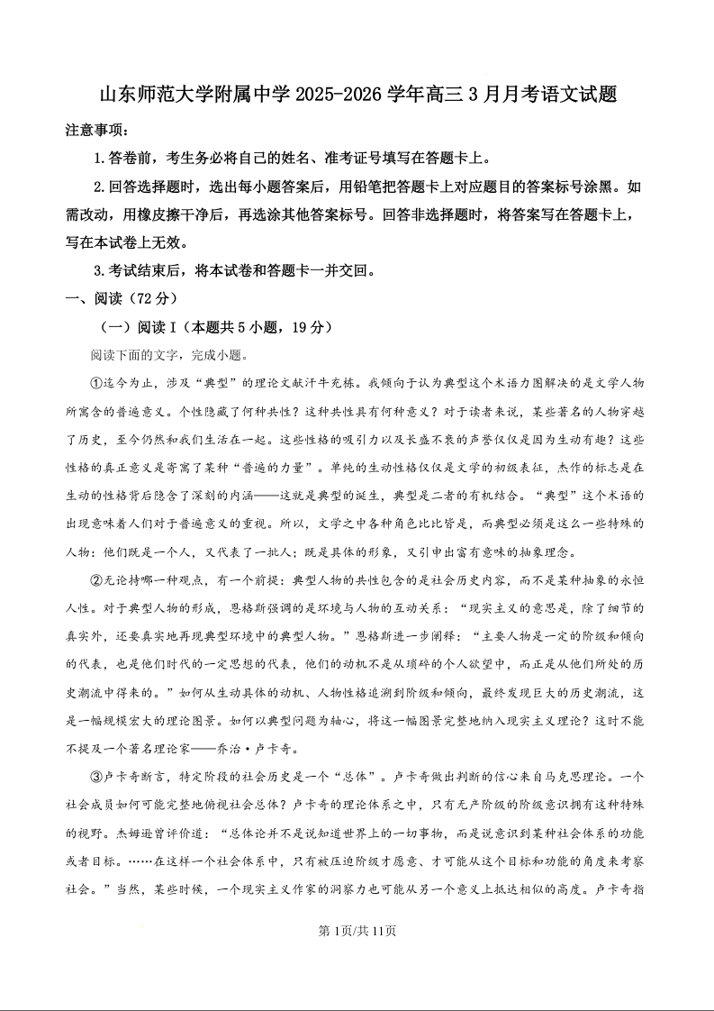 高三语文(原卷版)--山东师范大学附属中学2026届高三下学期3月阶段检测