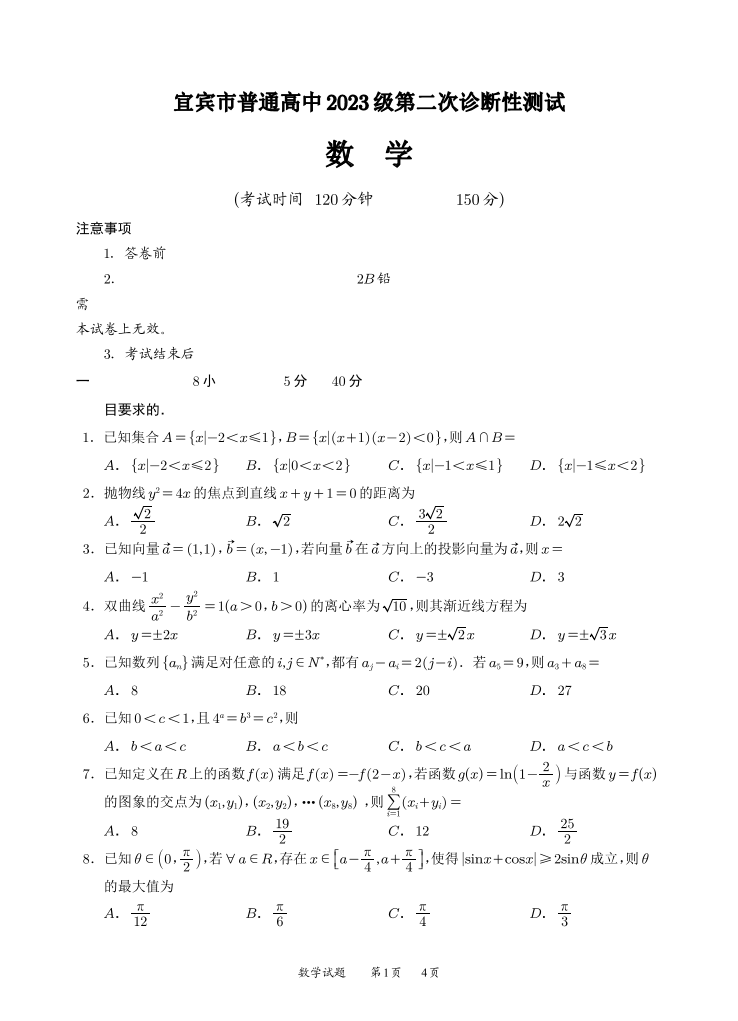 高三数学--四川省宜宾市普通高中2023级第二次诊断性测试(宜宾二诊)