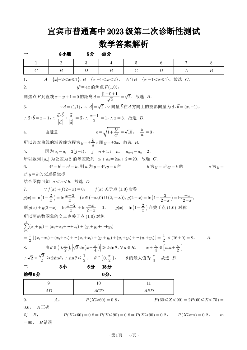 高三数学答案--四川省宜宾市普通高中2023级第二次诊断性测试(宜宾二诊)