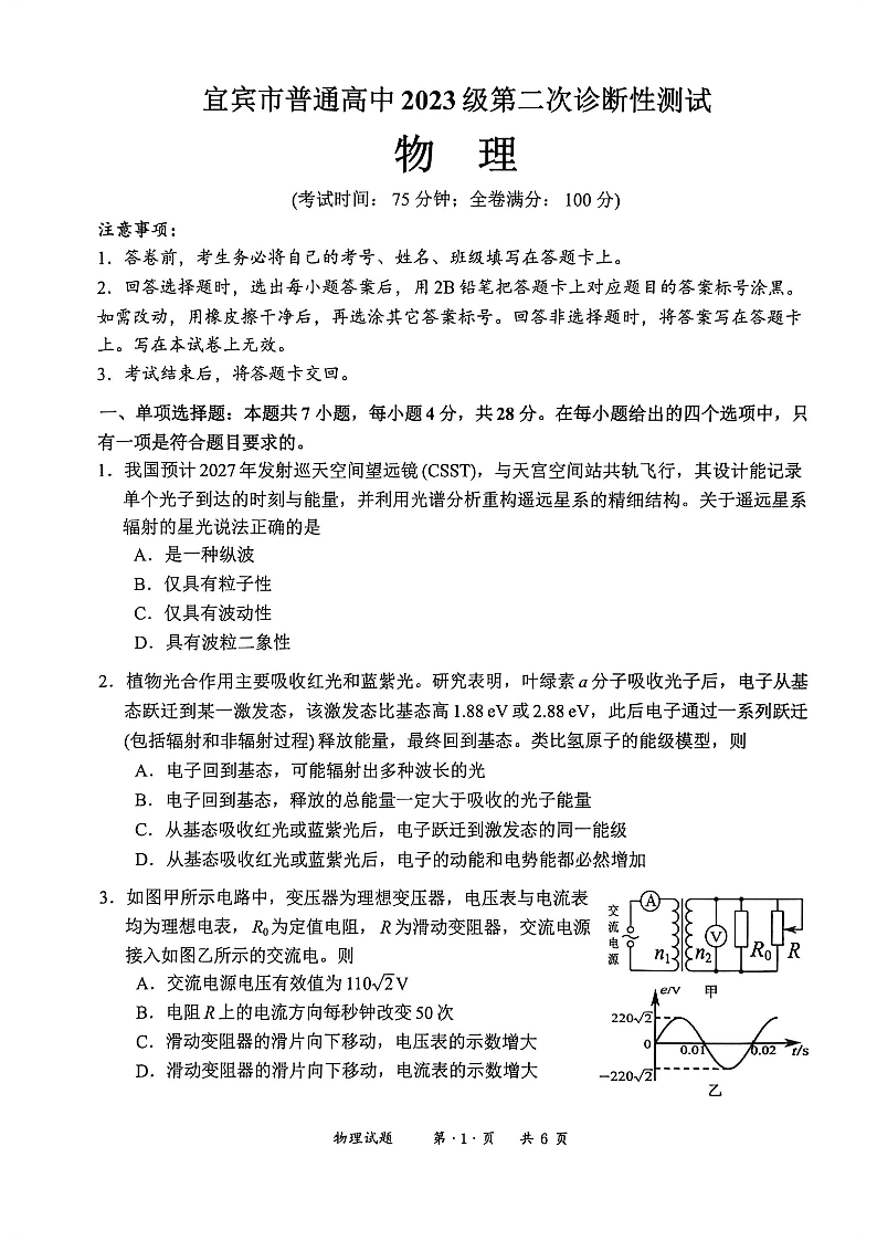 高三物理--四川省宜宾市普通高中2023级第二次诊断性测试(宜宾二诊)