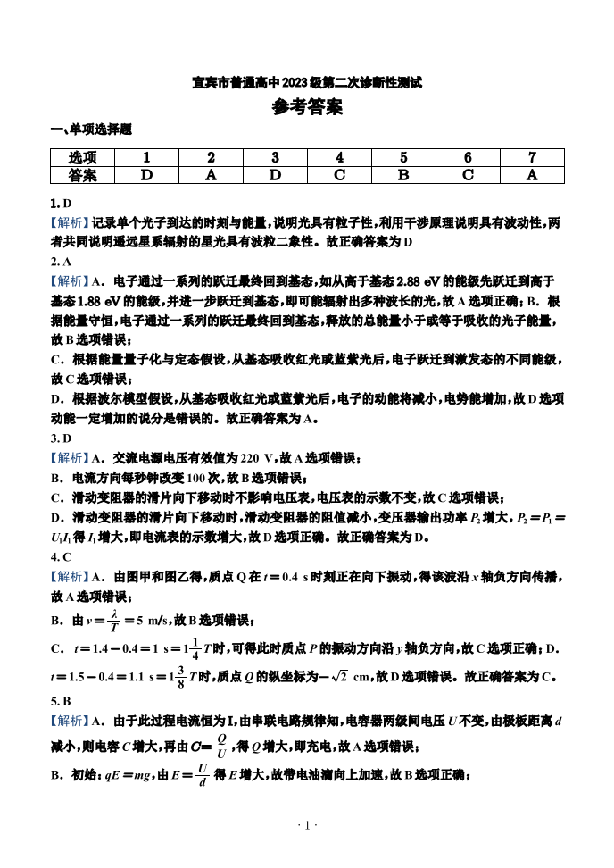 高三物理答案--四川省宜宾市普通高中2023级第二次诊断性测试(宜宾二诊)