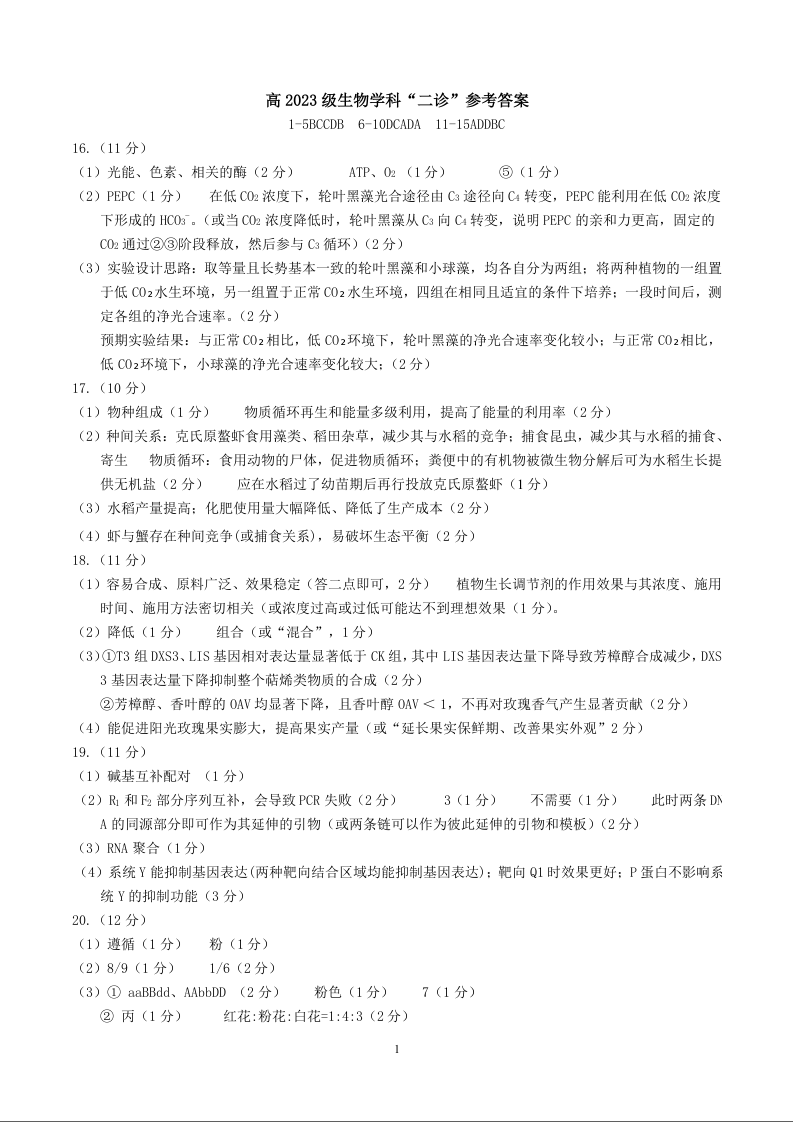 高三生物答案--四川省宜宾市普通高中2023级第二次诊断性测试(宜宾二诊)