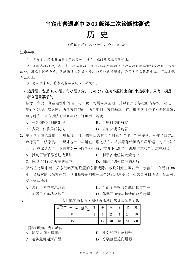 高三历史--四川省宜宾市普通高中2023级第二次诊断性测试(宜宾二诊)