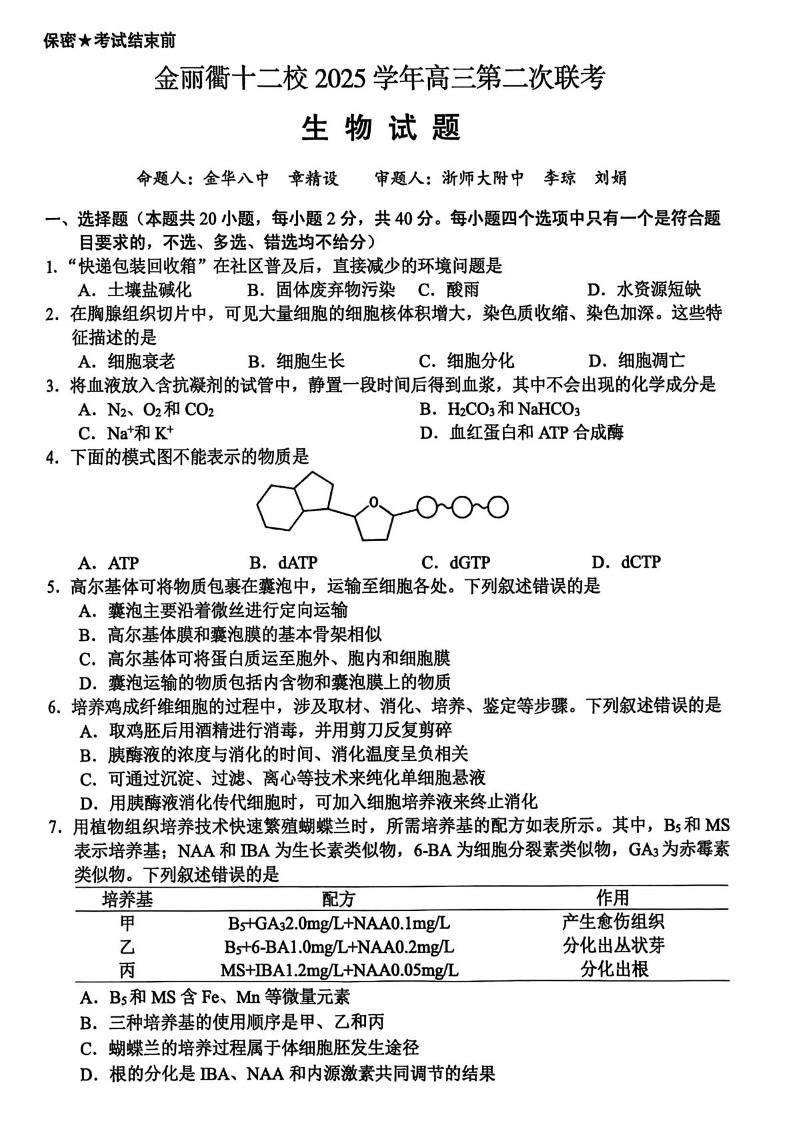 高三生物--浙江省金丽衢十二校2026届高三第二次联考
