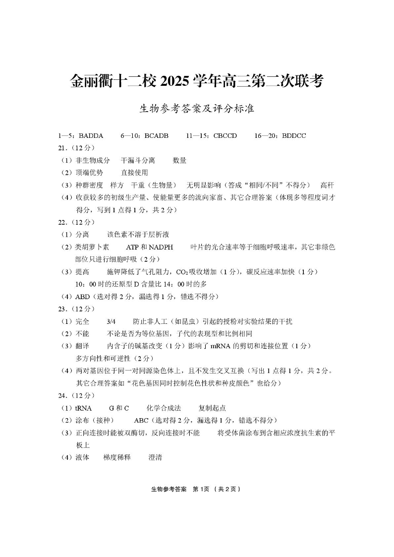 高三生物答案--浙江省金丽衢十二校2026届高三第二次联考