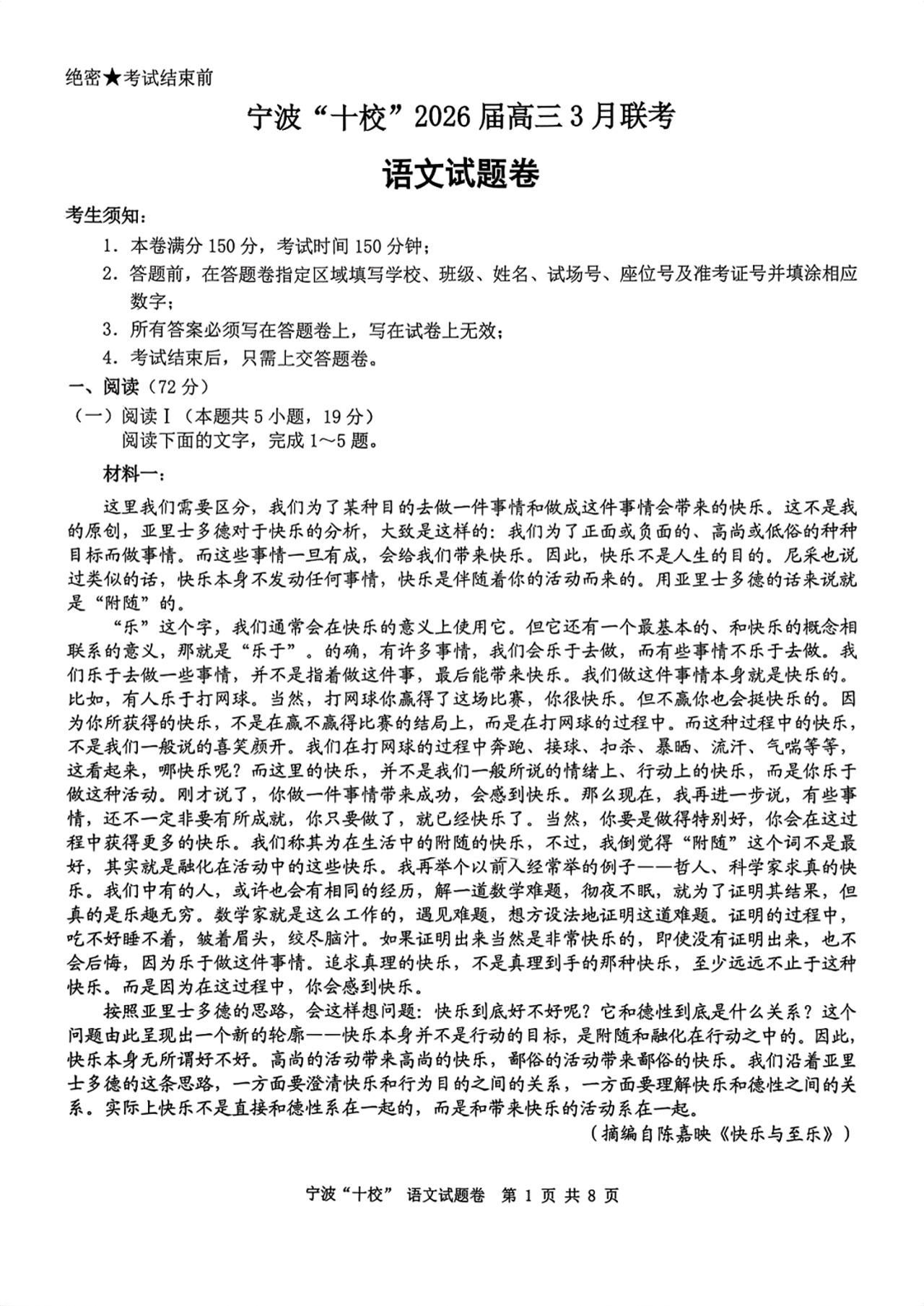 高三语文--浙江省宁波十校2026届高三3月联考(二模)