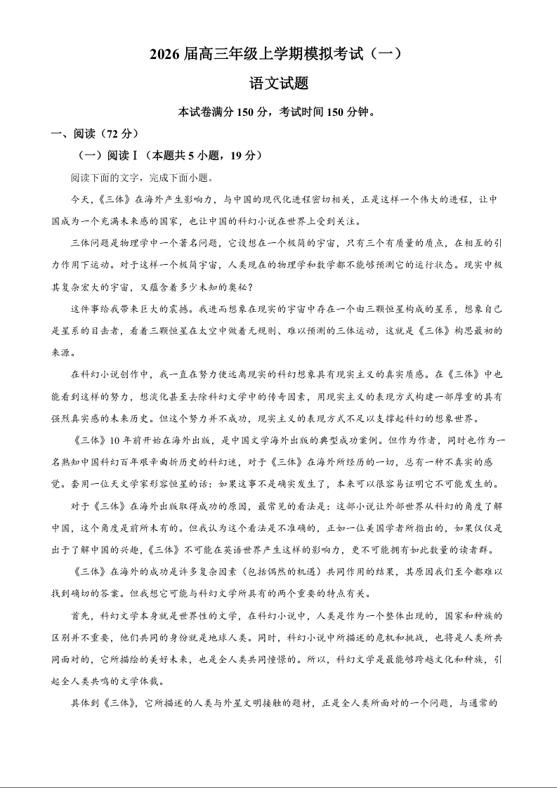 高三语文(原卷版)--河北省名校协作体2026届高三上学期模拟考试(一)