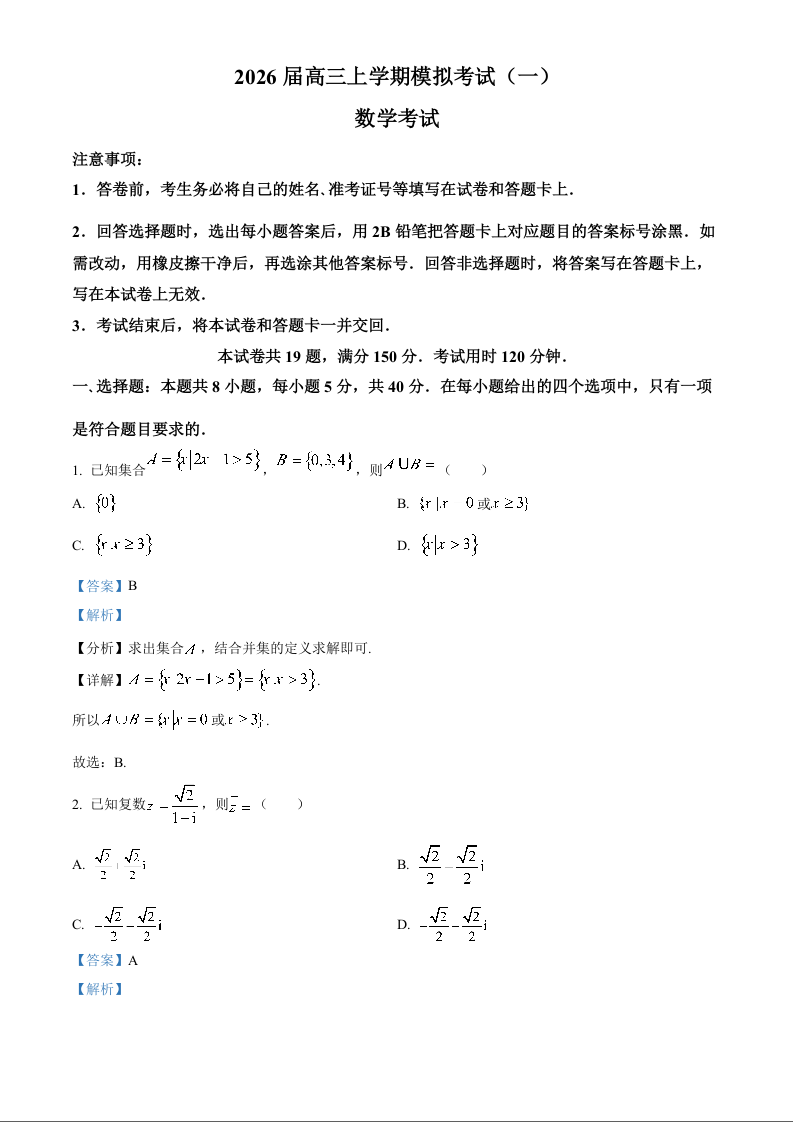 高三数学(解析版)--河北省名校协作体2026届高三上学期模拟考试(一)