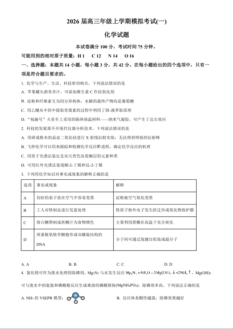 高三化学(原卷版)--河北省名校协作体2026届高三上学期模拟考试(一)