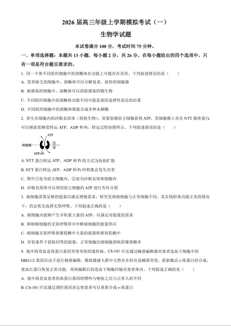 高三生物(原卷版)--河北省名校协作体2026届高三上学期模拟考试(一)