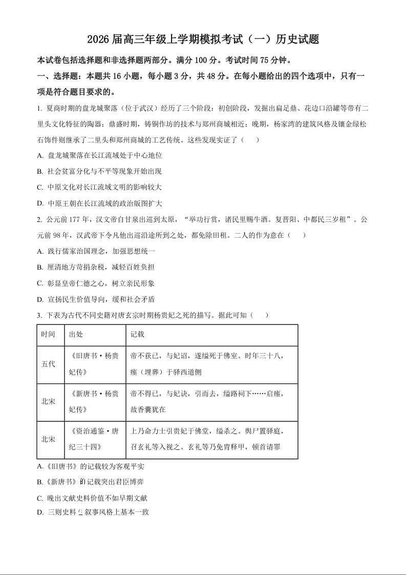 高三历史(原卷版)--河北省名校协作体2026届高三上学期模拟考试(一)