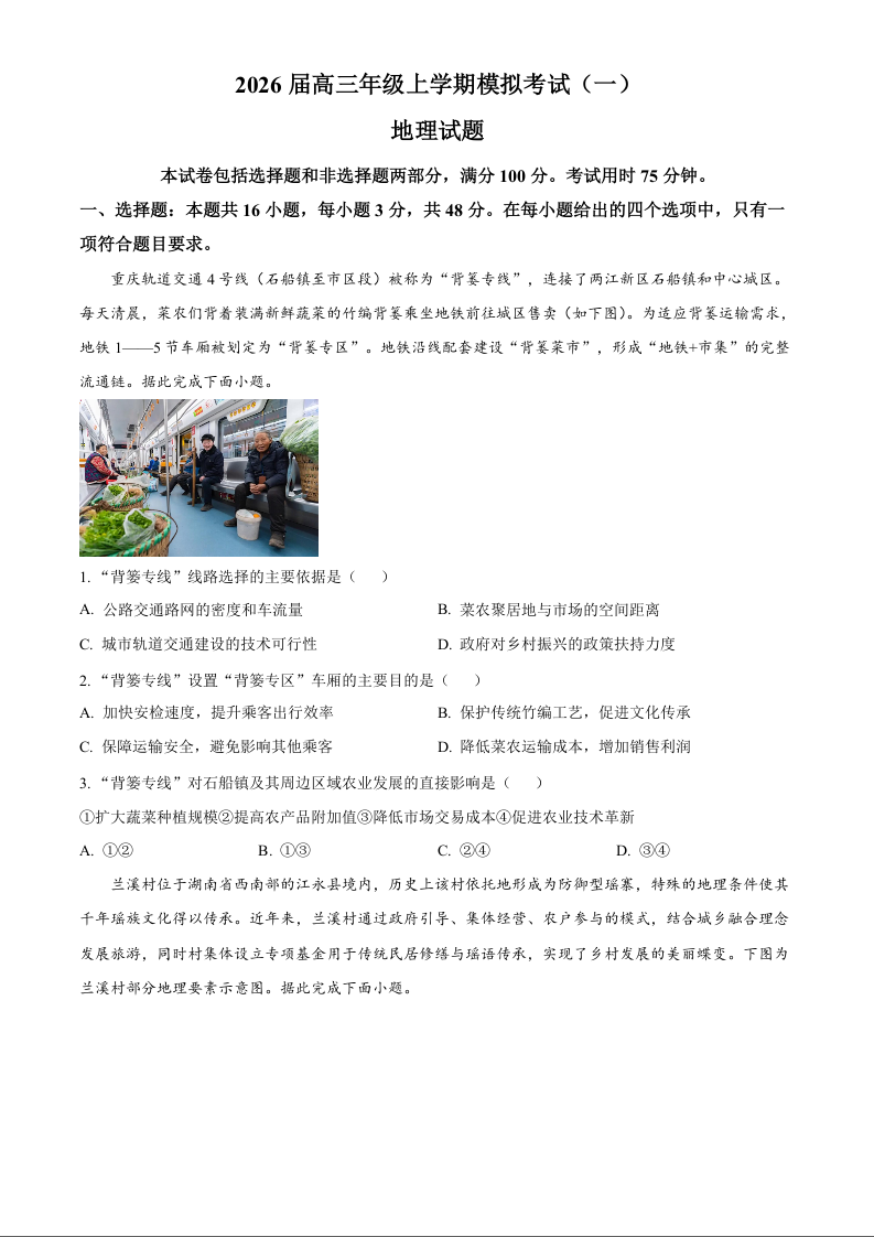 高三地理(原卷版)--河北省名校协作体2026届高三上学期模拟考试(一)