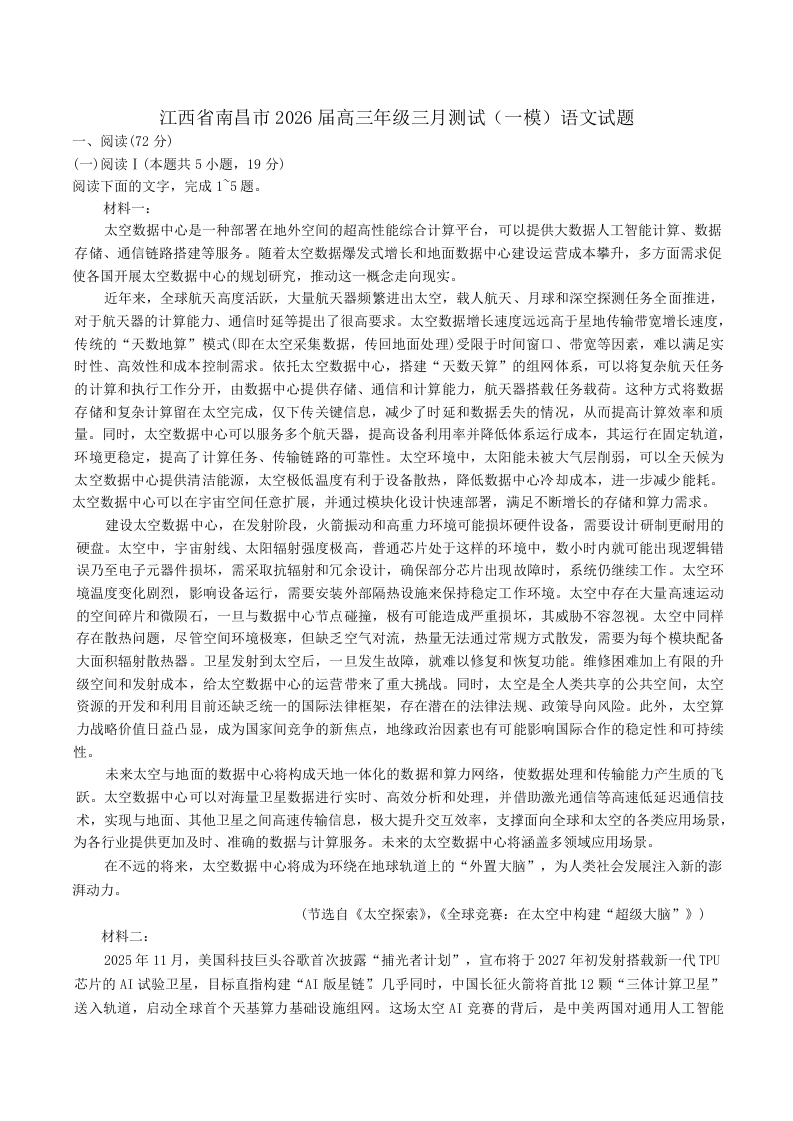 高三语文+答案--江西省南昌市2026届高三下学期三月测试(南昌一模)
