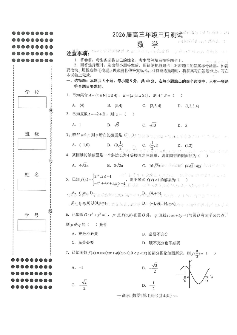 高三数学--江西省南昌市2026届高三下学期三月测试(南昌一模)