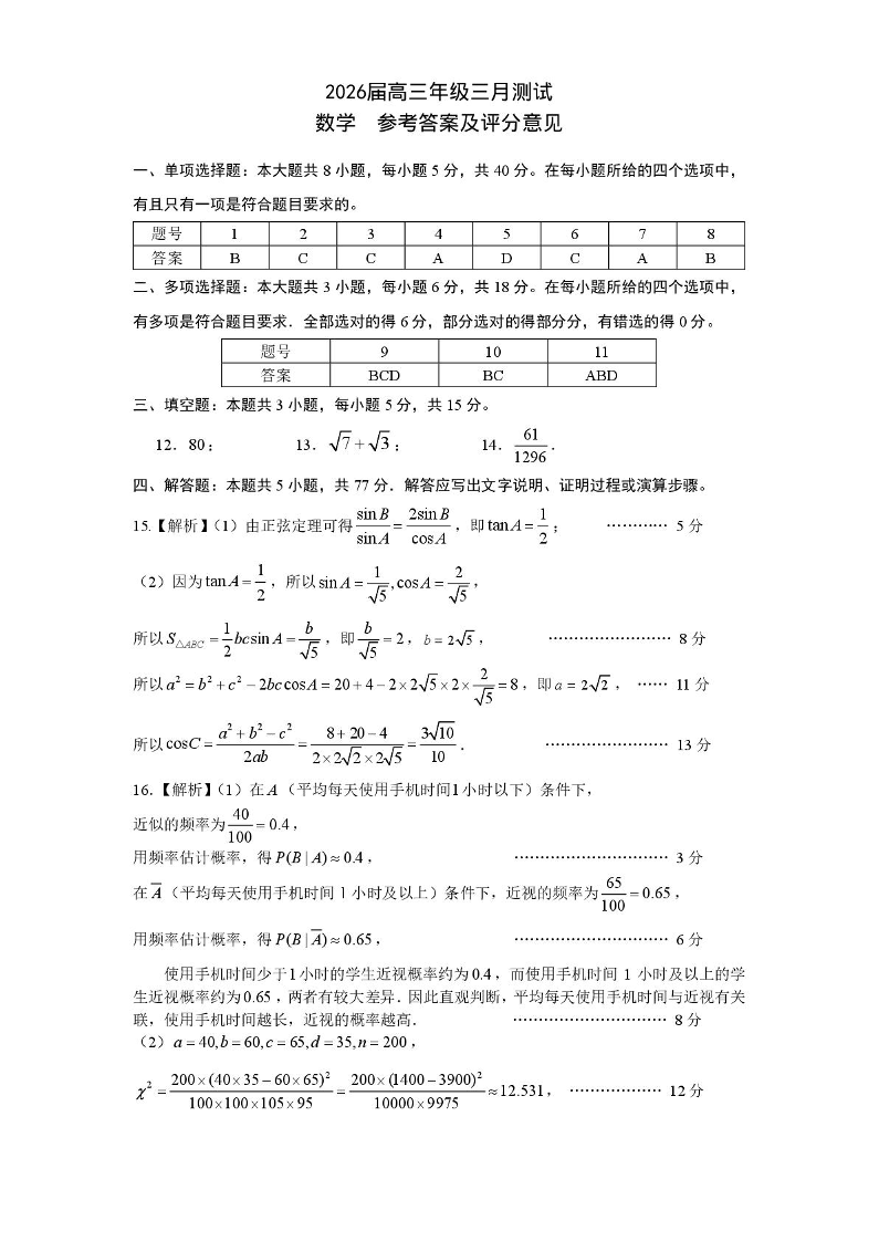 高三数学答案--江西省南昌市2026届高三下学期三月测试(南昌一模)