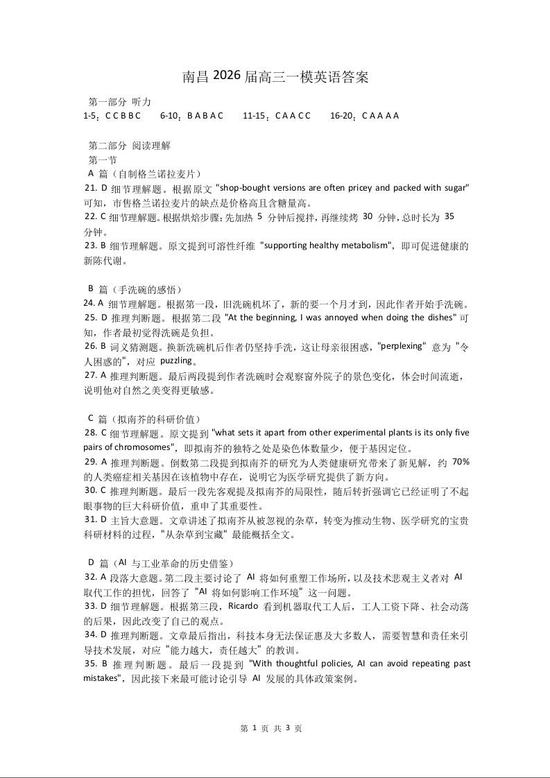 高三英语答案--江西省南昌市2026届高三下学期三月测试(南昌一模)