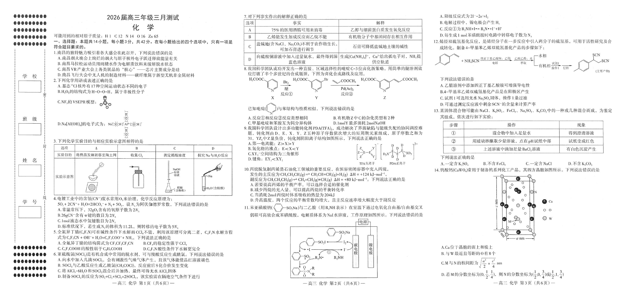 高三化学--江西省南昌市2026届高三下学期三月测试(南昌一模)