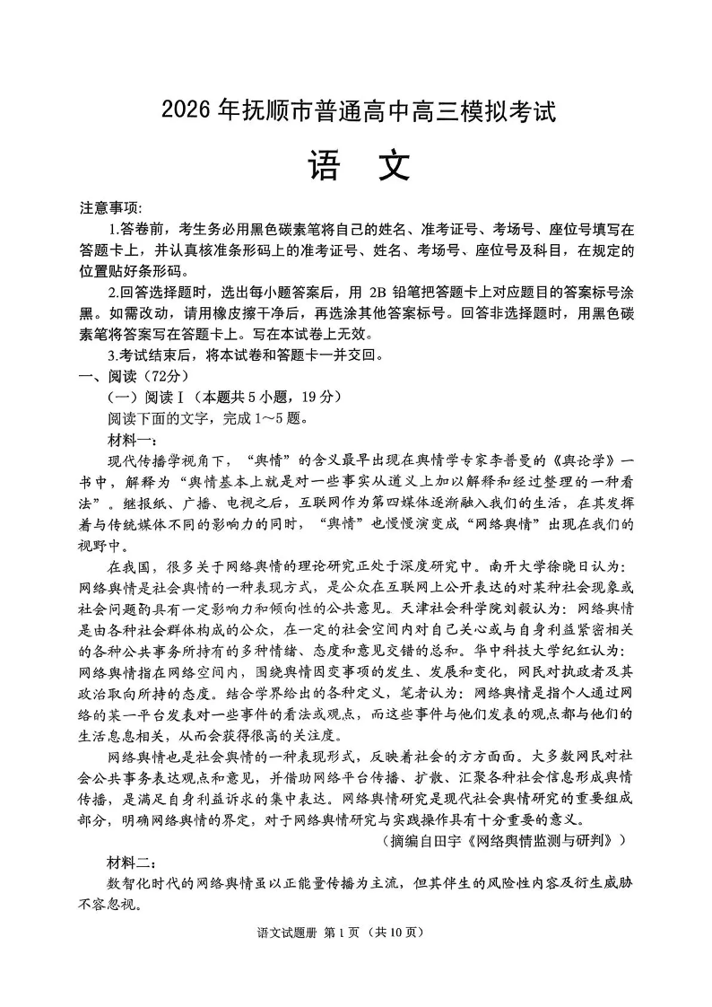 高三语文--辽宁省抚顺市2026届高三3月模拟考试(抚顺一模)