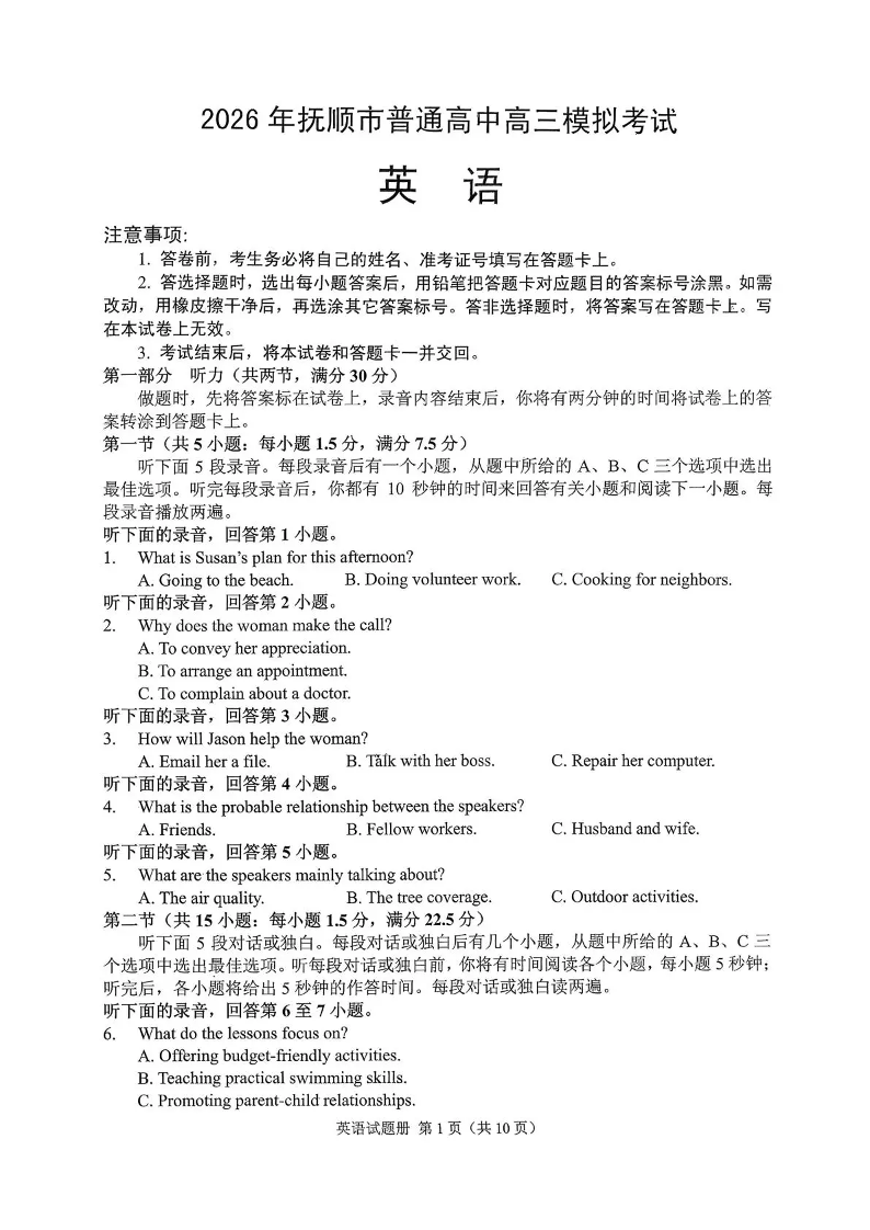 高三英语--辽宁省抚顺市2026届高三3月模拟考试(抚顺一模)