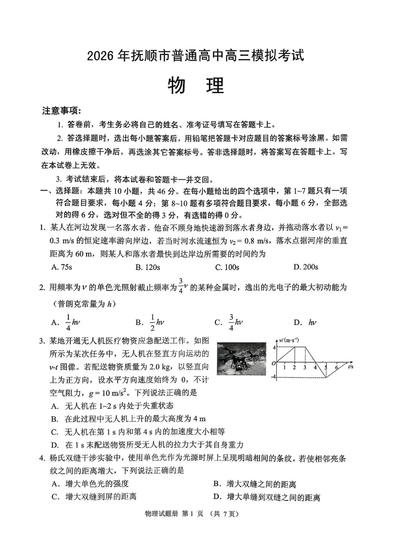 高三物理--辽宁省抚顺市2026届高三3月模拟考试(抚顺一模)