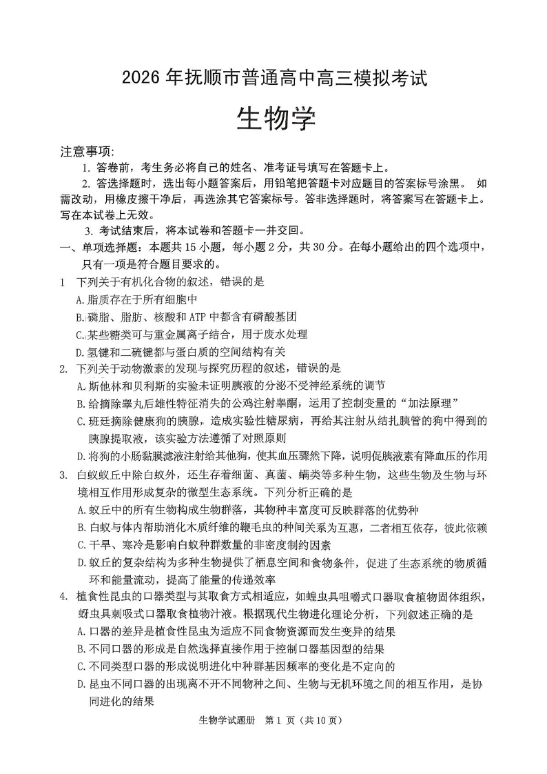 高三生物--辽宁省抚顺市2026届高三3月模拟考试(抚顺一模)
