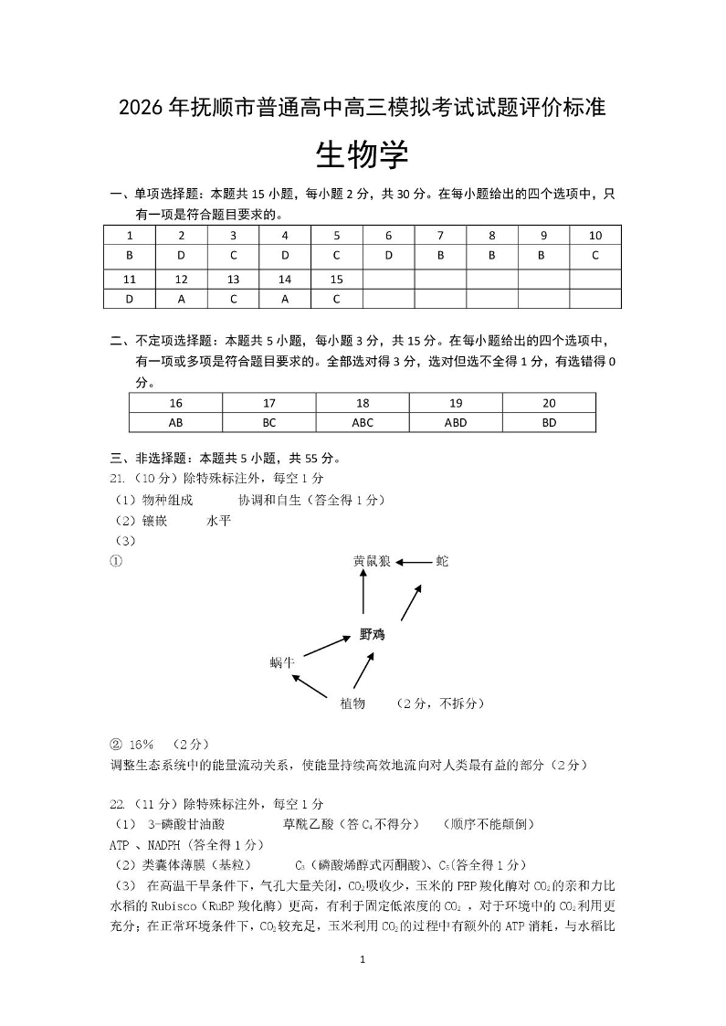 高三生物答案--辽宁省抚顺市2026届高三3月模拟考试(抚顺一模)