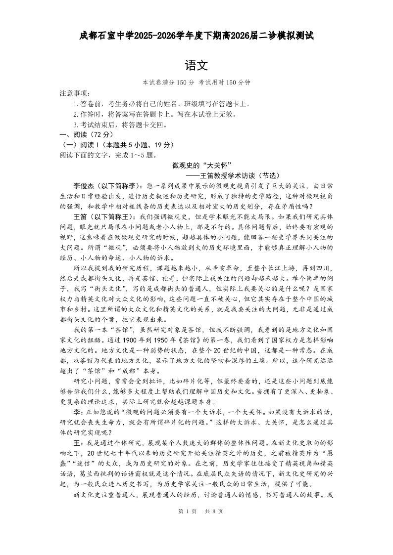 高三语文--四川省成都石室中学2026届2026届高三二诊模拟考试