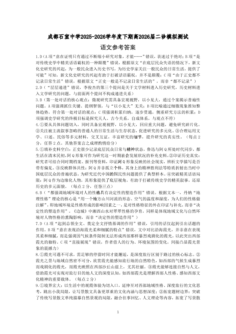 高三语文答案--四川省成都石室中学2026届2026届高三二诊模拟考试