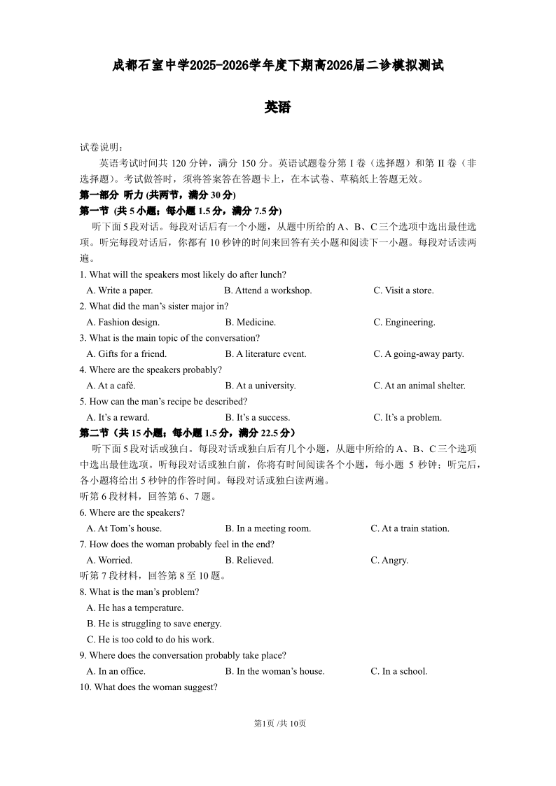 高三英语--四川省成都石室中学2026届2026届高三二诊模拟考试