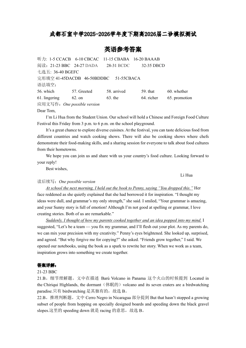高三英语答案--四川省成都石室中学2026届2026届高三二诊模拟考试