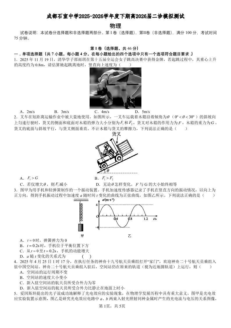 高三物理--四川省成都石室中学2026届2026届高三二诊模拟考试
