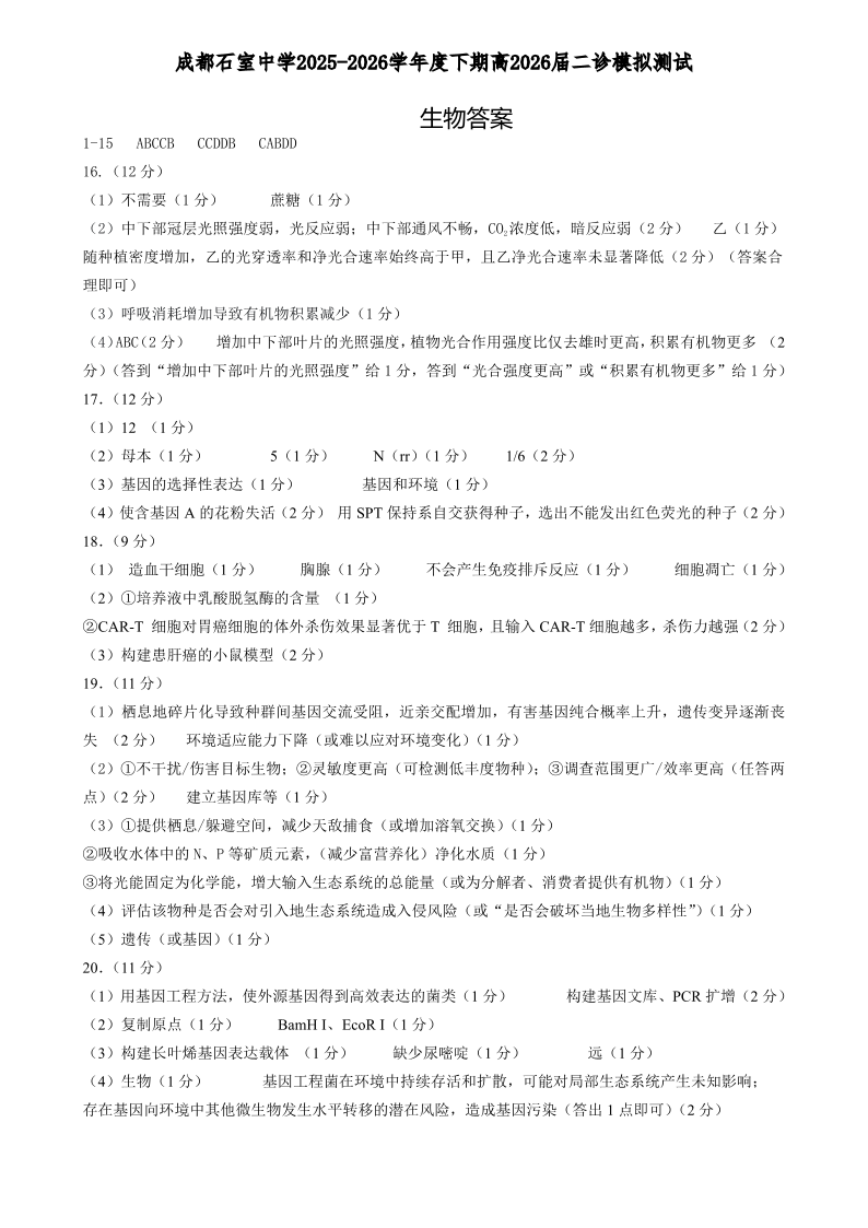 高三生物答案--四川省成都石室中学2026届2026届高三二诊模拟考试