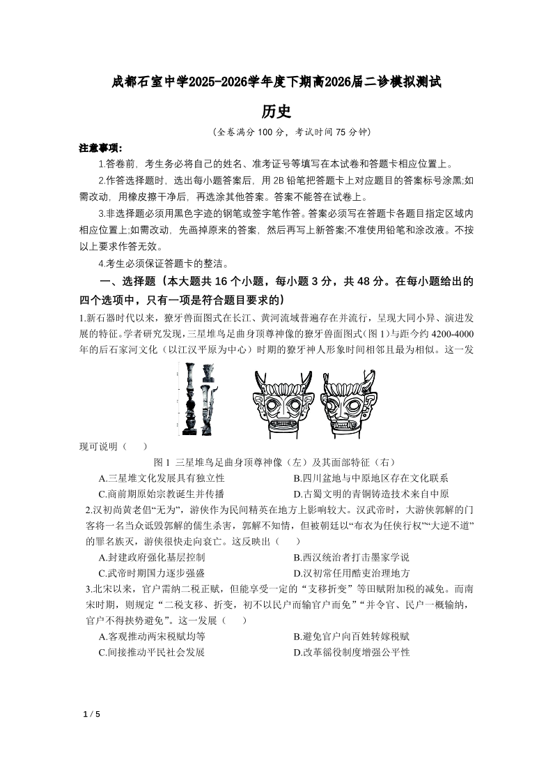 高三历史--四川省成都石室中学2026届2026届高三二诊模拟考试