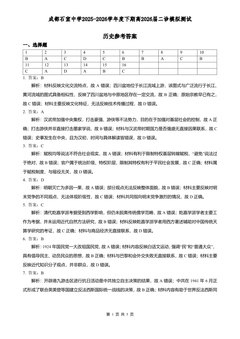 高三历史答案--四川省成都石室中学2026届2026届高三二诊模拟考试