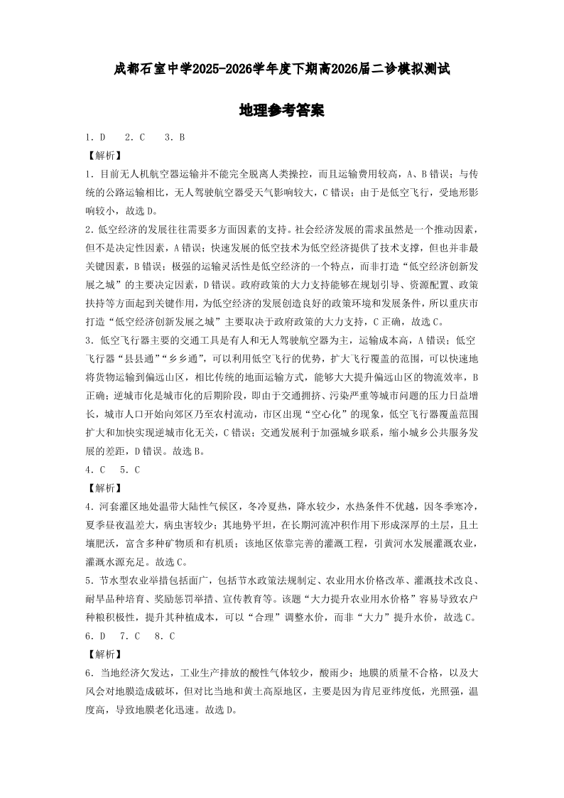 高三地理答案--四川省成都石室中学2026届2026届高三二诊模拟考试