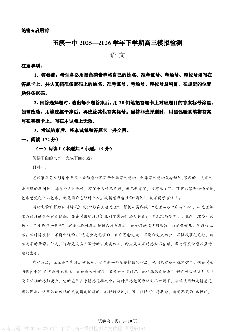 高三语文--云南玉溪第一中学2026届高三下学期3月模拟预测
