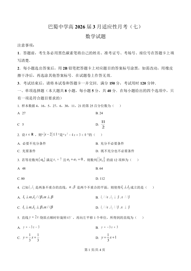 高三数学(原卷版)--重庆市巴蜀中学2026届高考适应性月考卷(七)