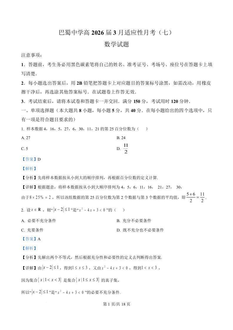 高三数学(解析版)--重庆市巴蜀中学2026届高考适应性月考卷(七)