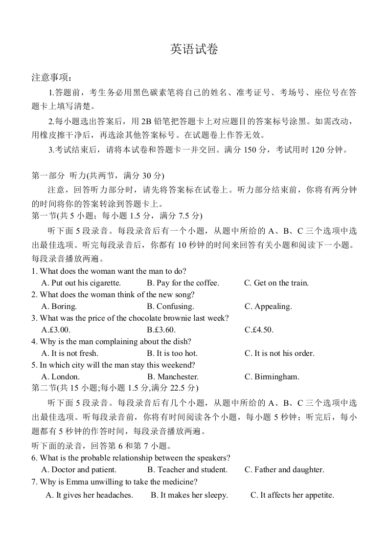 高三英语--重庆市巴蜀中学2026届高考适应性月考卷(七)