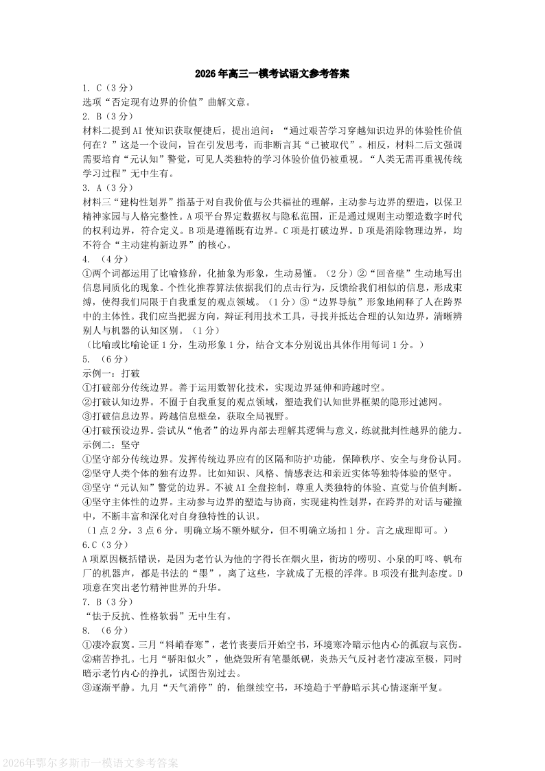 高三语文答案--内蒙古鄂尔多斯市2026届高三下学期3月第一次模拟考试
