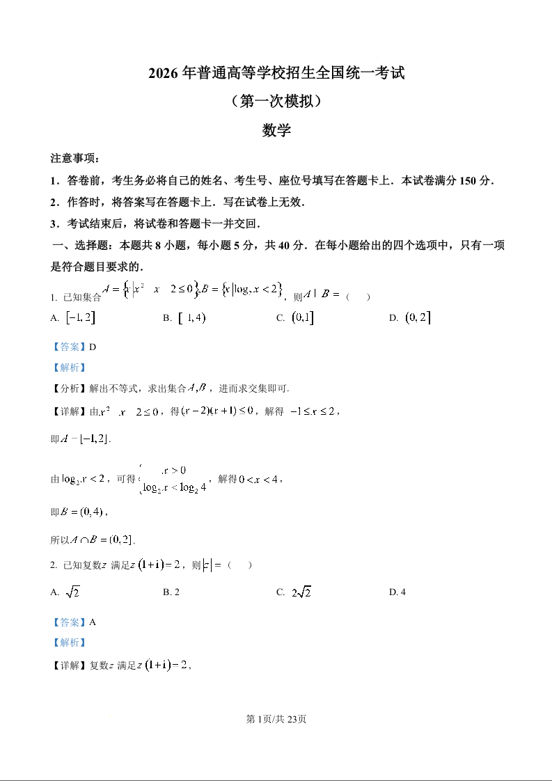 高三数学(解析版)--内蒙古鄂尔多斯市2026届高三下学期3月第一次模拟考试