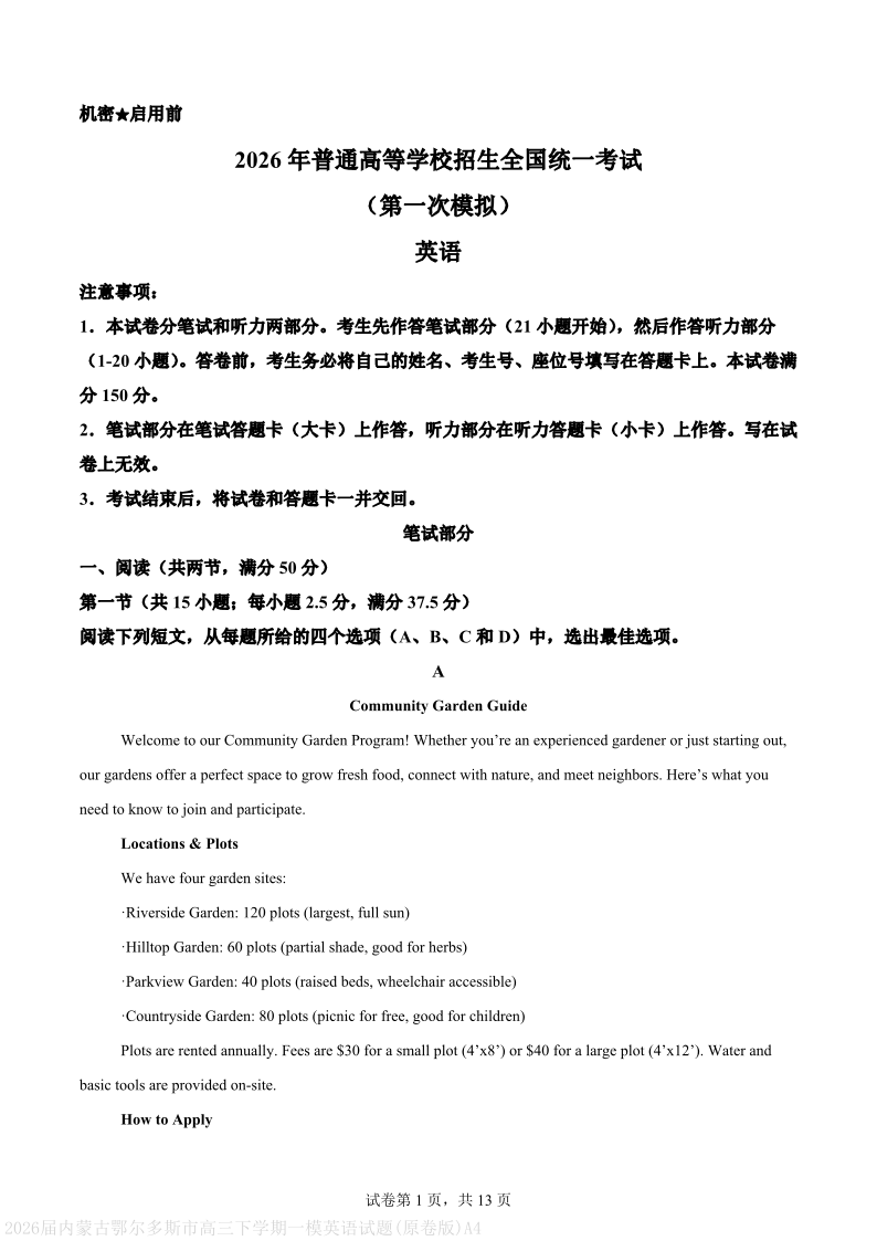 高三英语 (原卷版)--内蒙古鄂尔多斯市2026届高三下学期3月第一次模拟考试