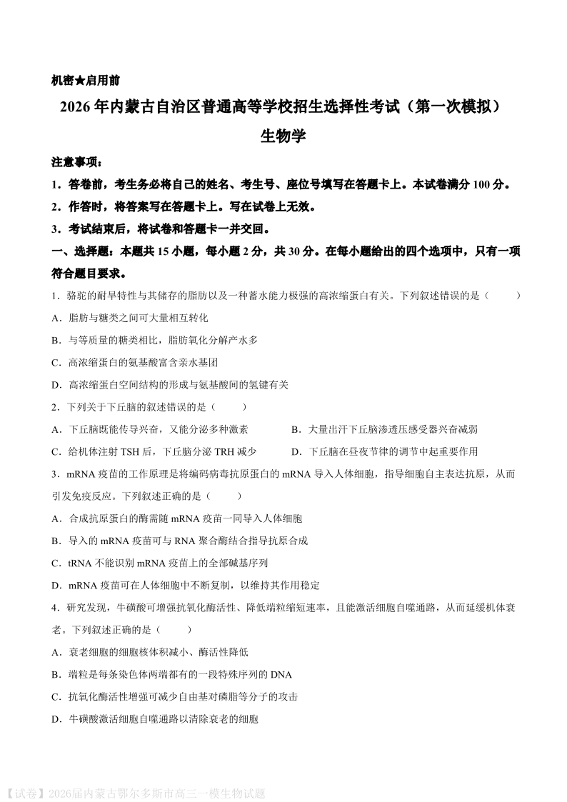 高三生物--内蒙古鄂尔多斯市2026届高三下学期3月第一次模拟考试