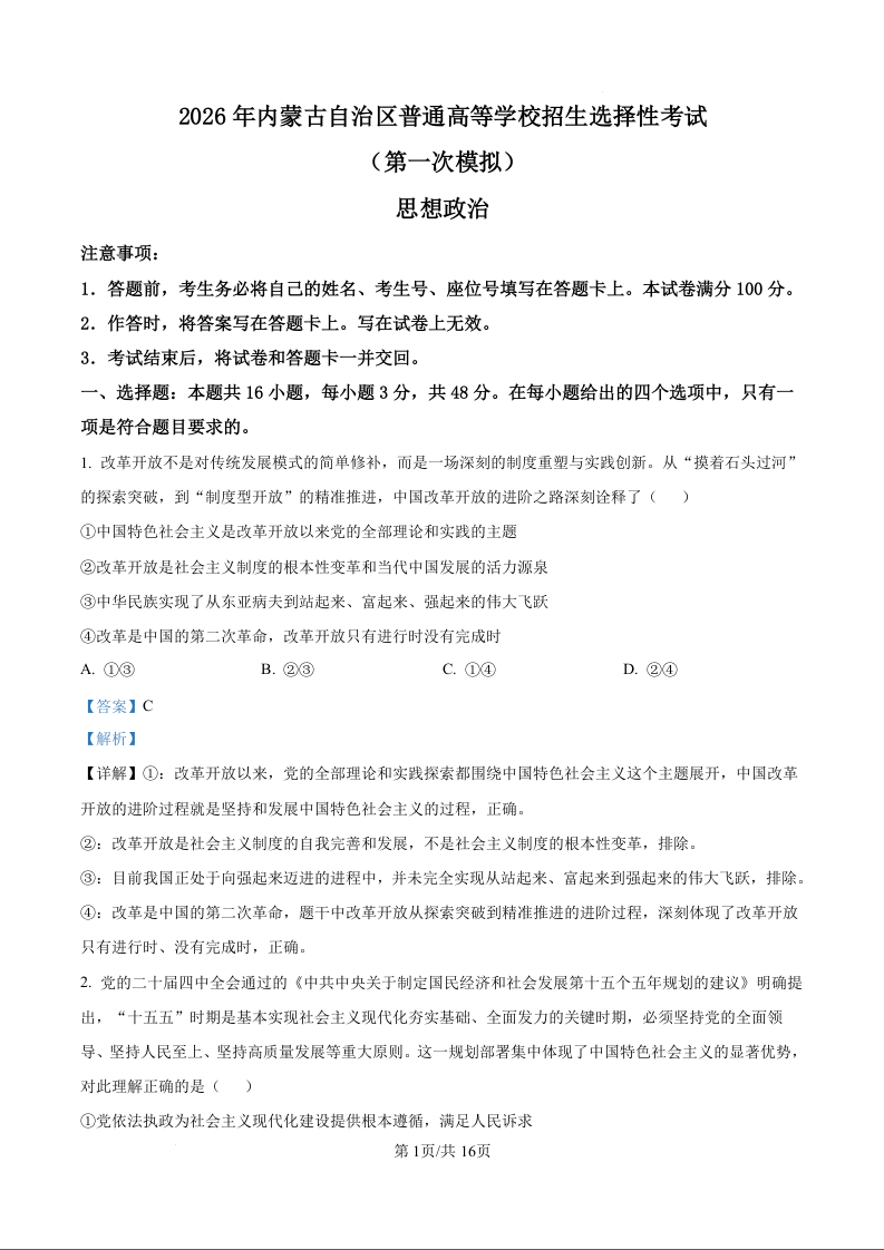 高三政治(解析版)--内蒙古鄂尔多斯市2026届高三下学期3月第一次模拟考试