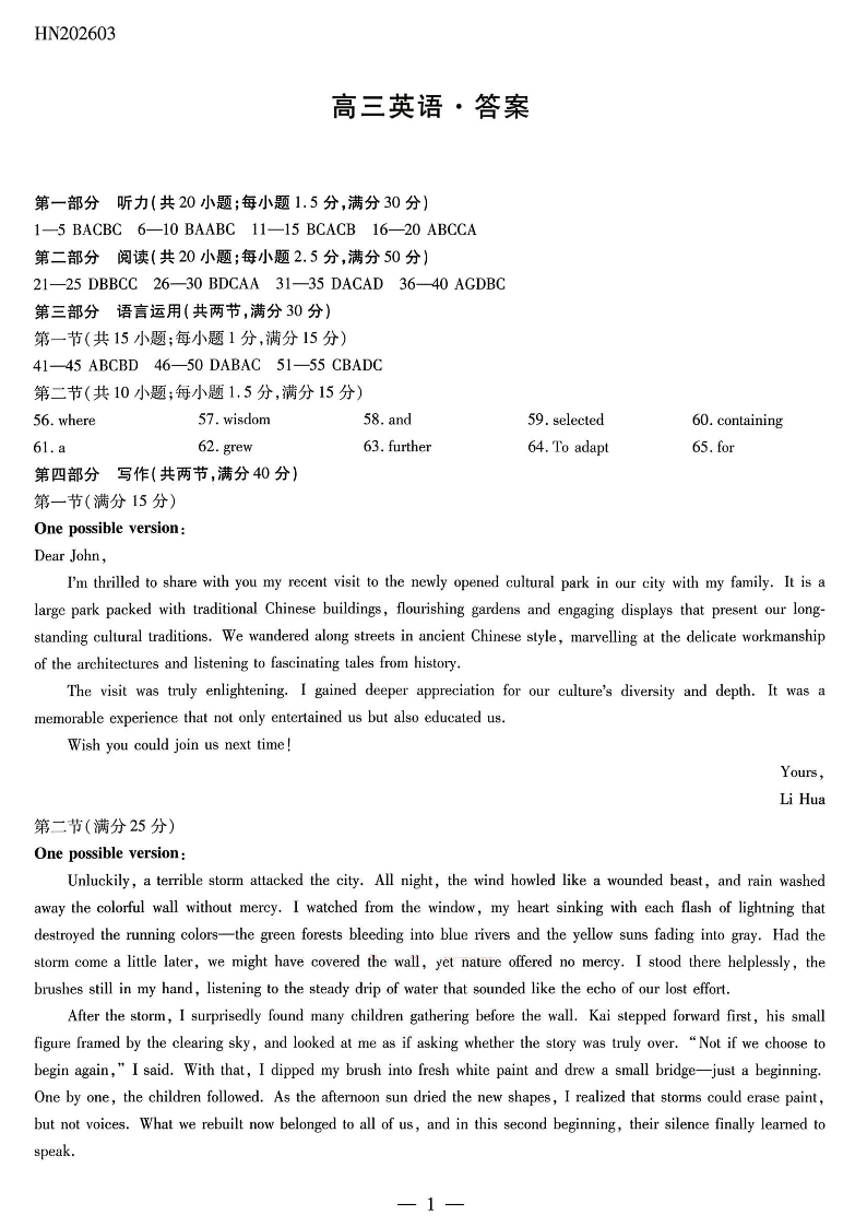 高三英语答案--湖南省湘一名校联盟2026届高三下学期3月二模考试