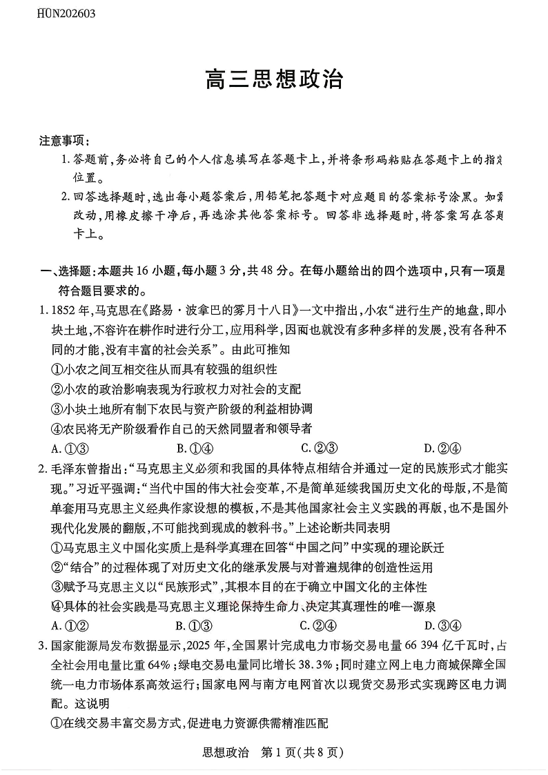 高三政治--湖南省湘一名校联盟2026届高三下学期3月二模考试