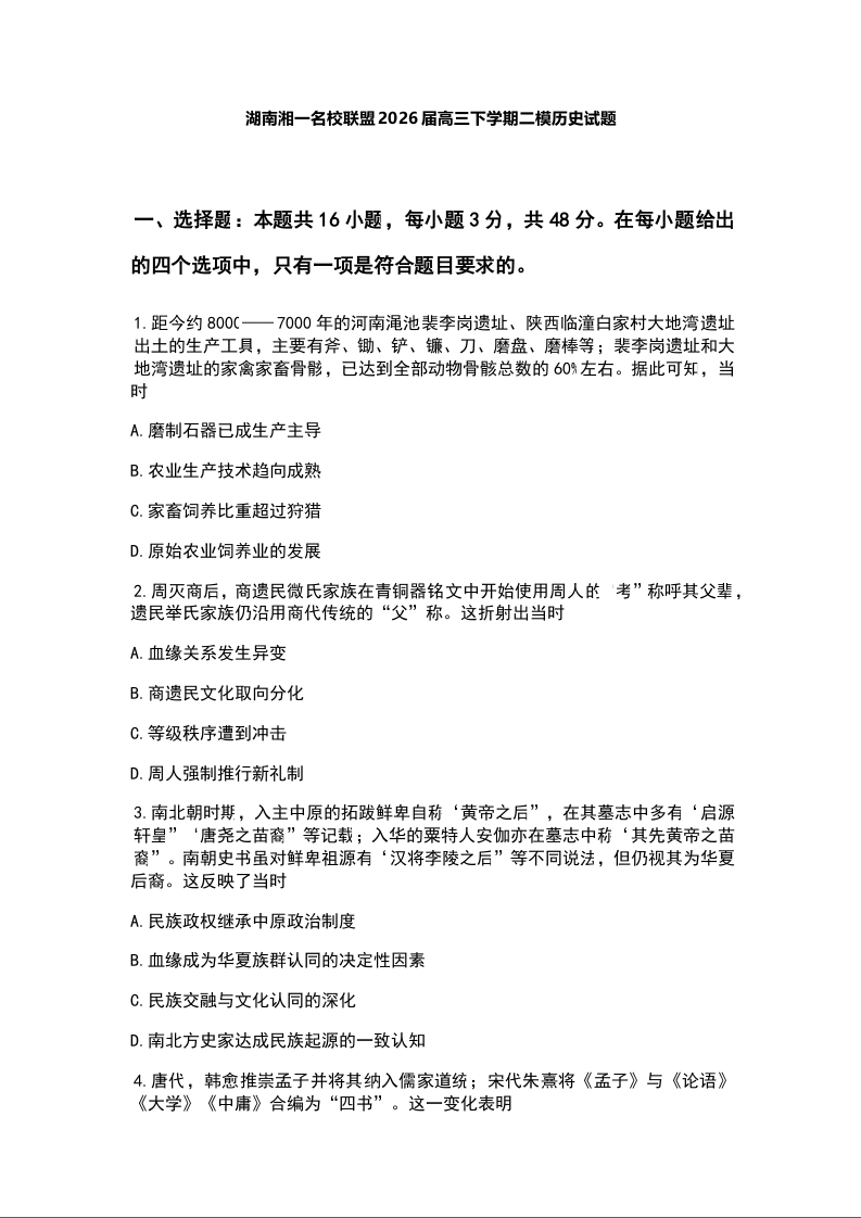 高三历史+答案--湖南省湘一名校联盟2026届高三下学期3月二模考试