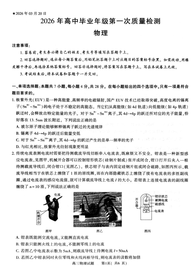 高三物理--河南省驻马店市、南阳市、信阳市2026届高三下学期3月质量检测