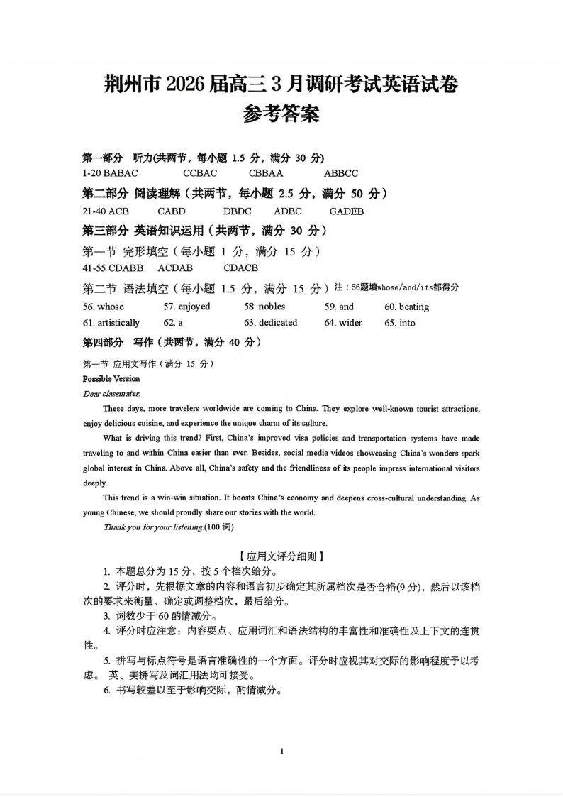 高三英语答案-湖北省荆州市2026届高三3月调研考试